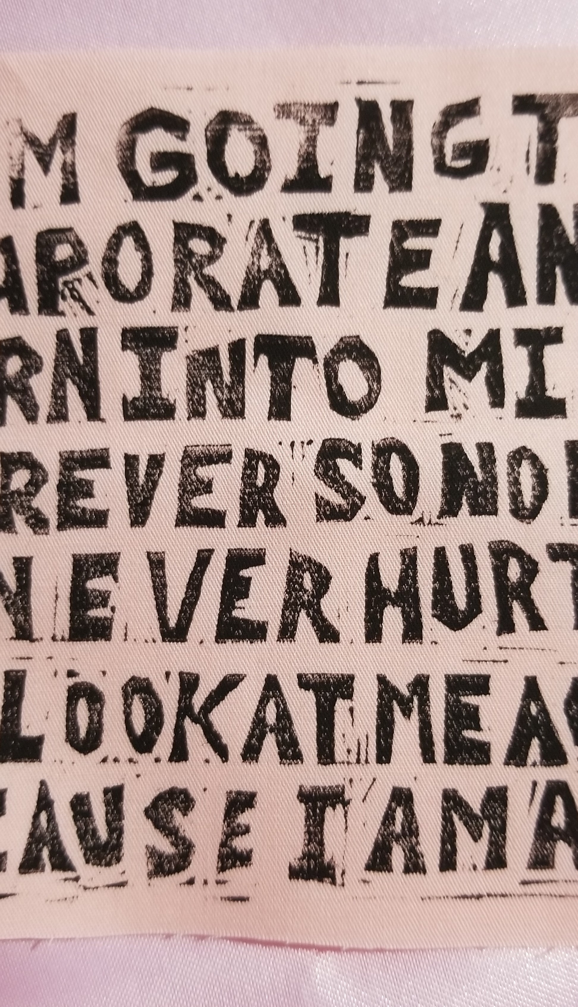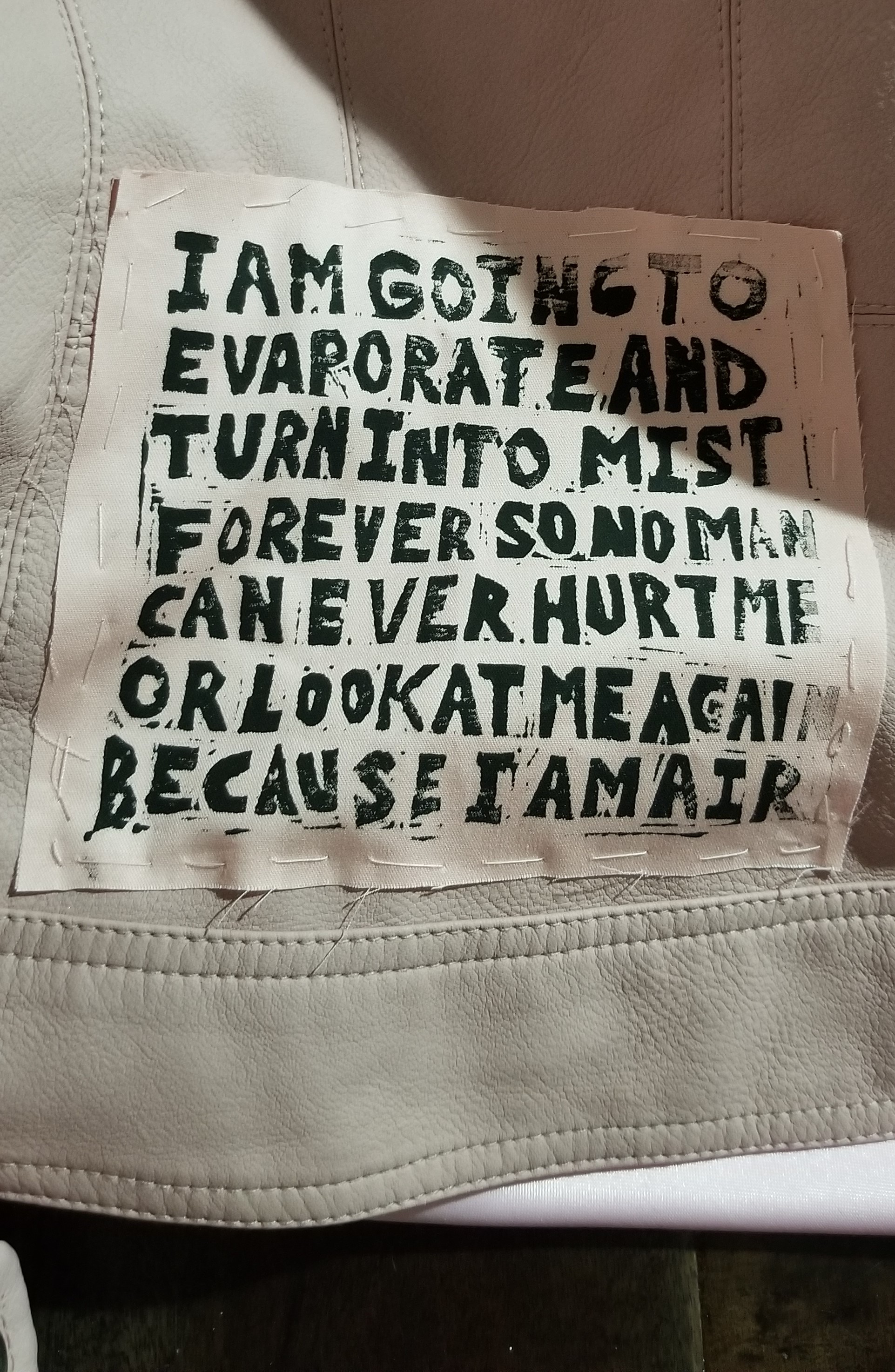 'I am going to evaporate and turn into mist forever so that no man can ever hurt me or look at me again because I am air' pale pink twill linocut patch