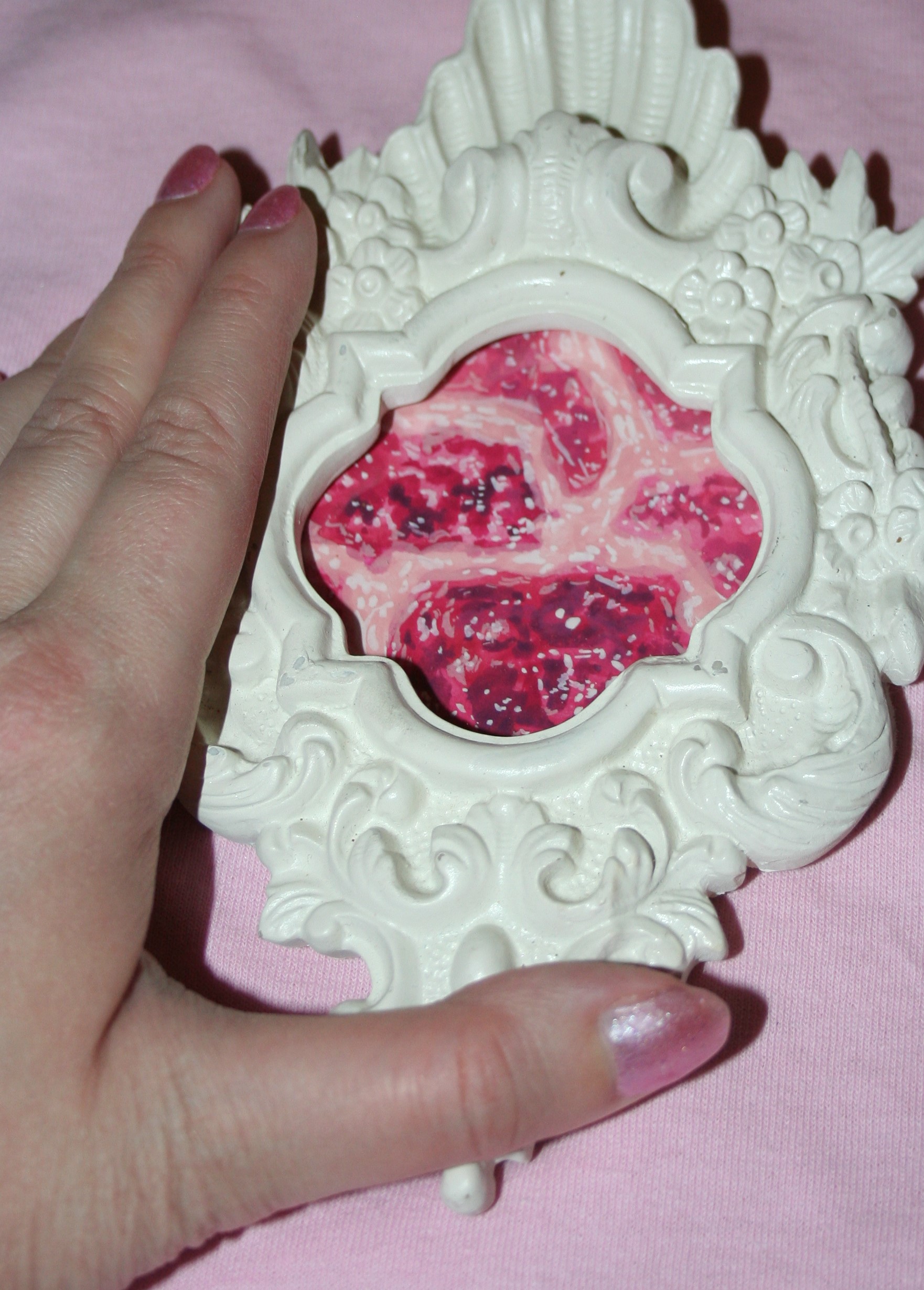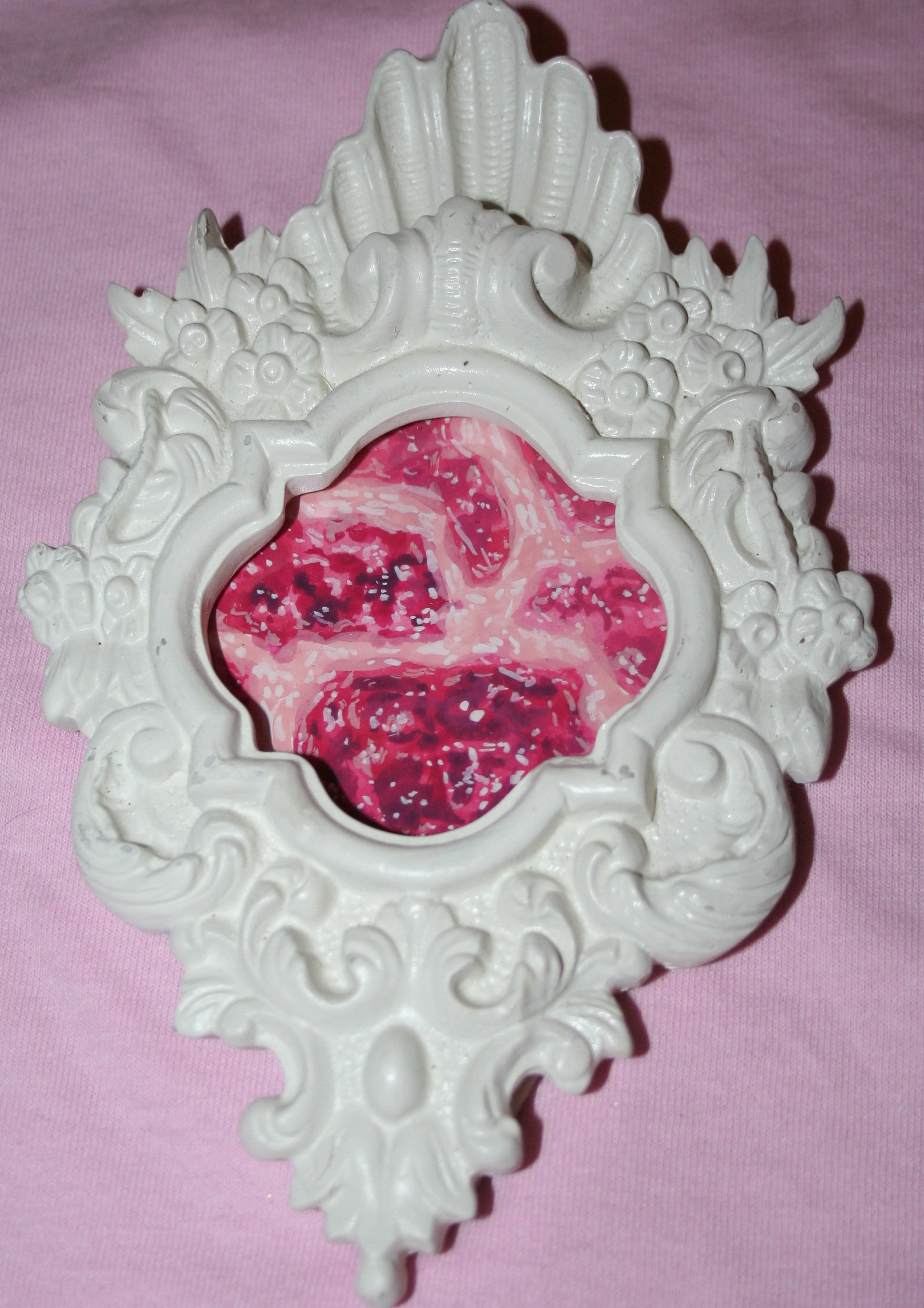 approx 7 by 4 miniature original meat painting framed. hook to hang on back