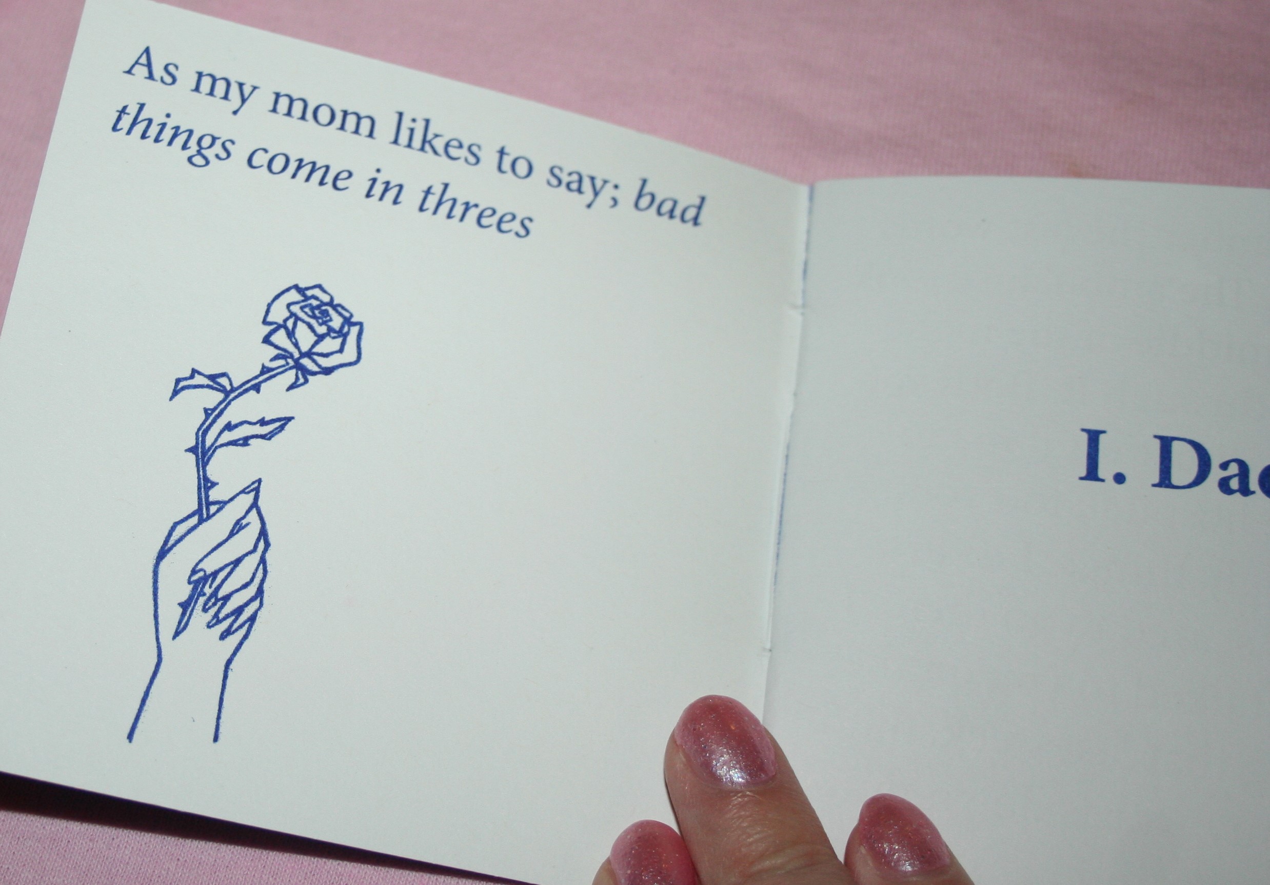 20 page, 4 by 4, blue riso perzine on death and loss at a young age